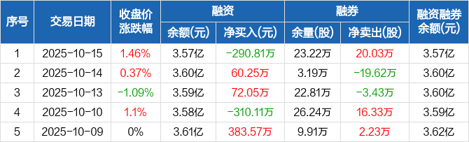 融资方面,当日融资买入741.26万元,融资偿还1032.07万元,融资净偿还290.81万元。融券方面,融券卖出20.76万股,融券偿还7300股,融券余量23.22万股,融券余额64.55万元。融资融券余额合计3.57亿元。