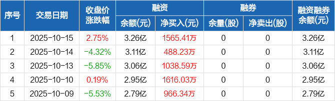 融资方面,当日融资买入5208.47万元,融资偿还3643.06万元,融资净买入1565.41万元,连续9日净买入累计1.06亿元。融券方面,融券卖出0股,融券偿还0股,融券余量0股,融券余额0元。融资融券余额合计3.26亿元。