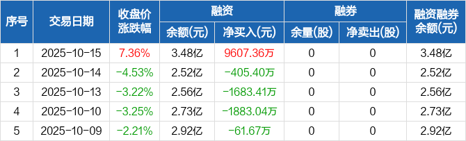 融资方面,当日融资买入1.48亿元,融资偿还5149.27万元,融资净买入9607.36万元。融券方面,融券卖出0股,融券偿还0股,融券余量0股,融券余额0元。融资融券余额合计3.48亿元。