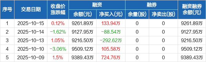 融资方面,当日融资买入640.95万元,融资偿还507.01万元,融资净买入133.94万元。融券方面,融券卖出0股,融券偿还0股,融券余量0股,融券余额0元。融资融券余额合计9261.89万元。