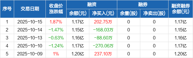 鼎龙科技融资融券信息显示,2025年10月15日融资净买入202.75万元;融资余额1.17亿元,较前一日增加1.77%。