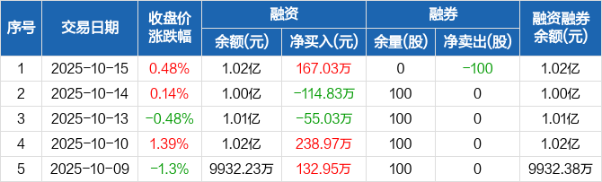 融资方面,当日融资买入464.31万元,融资偿还297.28万元,融资净买入167.03万元。融券方面,融券卖出0股,融券偿还100股,融券余量0股,融券余额0元。融资融券余额合计1.02亿元。