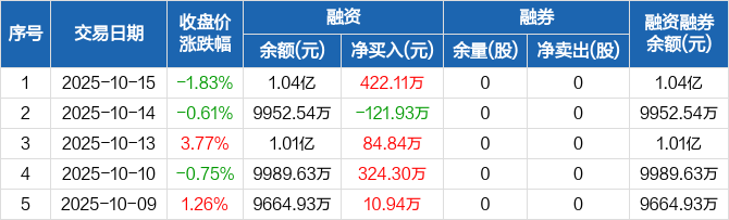 融资方面,当日融资买入994.25万元,融资偿还572.14万元,融资净买入422.11万元。融券方面,融券卖出0股,融券偿还0股,融券余量0股,融券余额0元。融资融券余额合计1.04亿元。