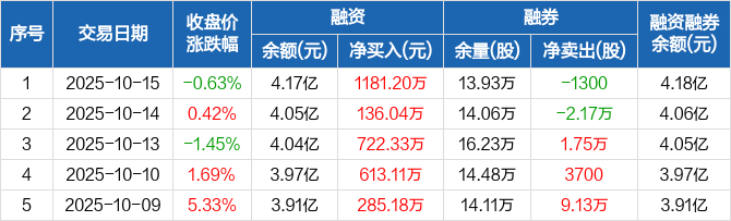 贵州轮胎融资融券信息显示,2025年10月15日融资净买入1181.2万元;融资余额4.17亿元,较前一日增加2.91%。