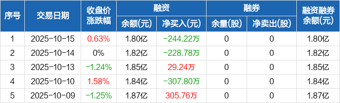 融资方面,当日融资买入387.53万元,融资偿还631.76万元,融资净偿还244.22万元。融券方面,融券卖出0股,融券偿还0股,融券余量0股,融券余额0元。融资融券余额合计1.8亿元。