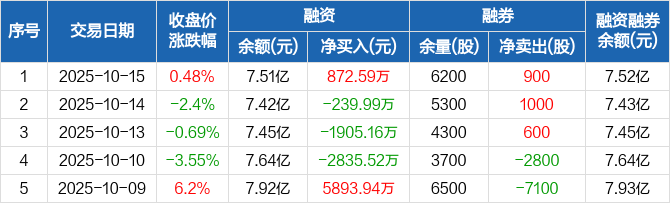 融资方面,当日融资买入5245.29万元,融资偿还4372.71万元,融资净买入872.59万元。融券方面,融券卖出900股,融券偿还0股,融券余量6200股,融券余额32.44万元。融资融券余额合计7.52亿元。