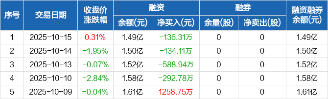 融资方面,当日融资买入925.71万元,融资偿还1062.03万元,融资净偿还136.31万元,连续4日净偿还累计1152.14万元。融券方面,融券卖出0股,融券偿还0股,融券余量0股,融券余额0元。融资融券余额合计1.49亿元。