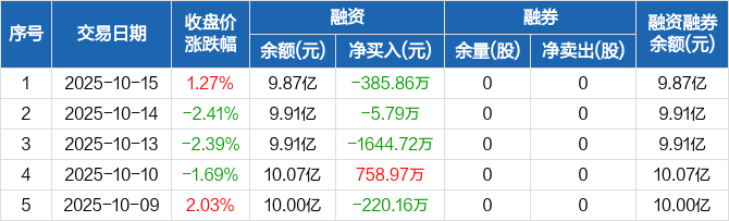 融资方面,当日融资买入814.73万元,融资偿还1200.59万元,融资净偿还385.86万元,连续3日净偿还累计2036.37万元。融券方面,融券卖出0股,融券偿还0股,融券余量0股,融券余额0元。融资融券余额合计9.87亿元。