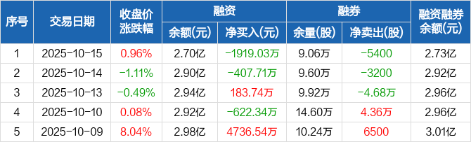 久立特材融资融券信息显示,2025年10月15日融资净偿还1919.03万元;融资余额2.7亿元,较前一日下降6.63%。