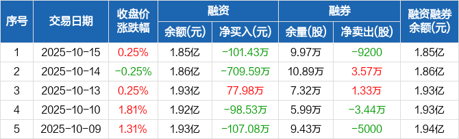 融资方面,当日融资买入262.33万元,融资偿还363.76万元,融资净偿还101.43万元。融券方面,融券卖出100股,融券偿还9300股,融券余量9.97万股,融券余额39.38万元。融资融券余额合计1.85亿元。