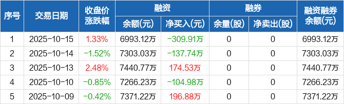 融资方面,当日融资买入288.59万元,融资偿还598.5万元,融资净偿还309.91万元。融券方面,融券卖出0股,融券偿还0股,融券余量0股,融券余额0元。融资融券余额合计6993.12万元。
