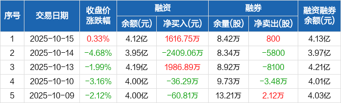 融资方面,当日融资买入4438.82万元,融资偿还2822.08万元,融资净买入1616.75万元。融券方面,融券卖出3700股,融券偿还2900股,融券余量8.42万股,融券余额155.01万元。融资融券余额合计4.13亿元。