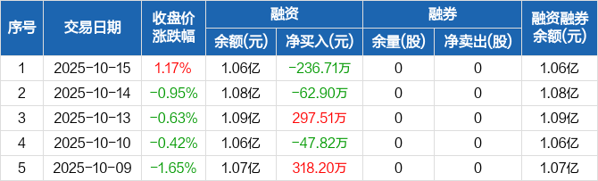融资方面,当日融资买入332.71万元,融资偿还569.42万元,融资净偿还236.71万元。融券方面,融券卖出0股,融券偿还0股,融券余量0股,融券余额0元。融资融券余额合计1.06亿元。