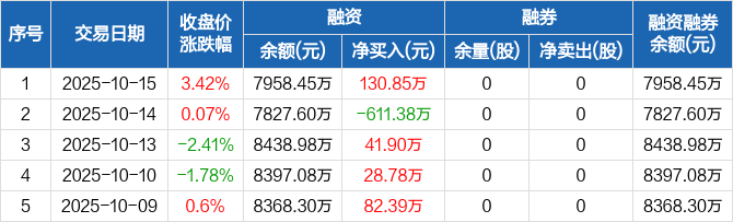 融资方面,当日融资买入421.18万元,融资偿还290.33万元,融资净买入130.85万元。融券方面,融券卖出0股,融券偿还0股,融券余量0股,融券余额0元。融资融券余额合计7958.45万元。
