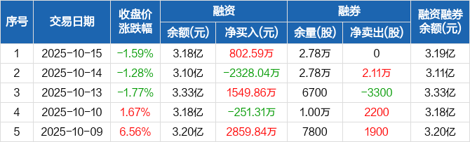 融资方面,当日融资买入6424.31万元,融资偿还5621.72万元,融资净买入802.59万元。融券方面,融券卖出1200股,融券偿还1200股,融券余量2.78万股,融券余额84.1万元。融资融券余额合计3.19亿元。