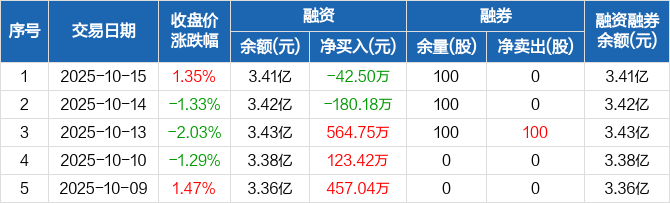 融资方面,当日融资买入657.94万元,融资偿还700.44万元,融资净偿还42.5万元。融券方面,融券卖出0股,融券偿还0股,融券余量100股,融券余额2408元。融资融券余额合计3.41亿元。