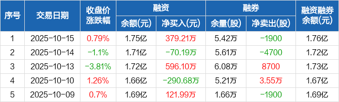 融资方面,当日融资买入1106.96万元,融资偿还727.74万元,融资净买入379.21万元。融券方面,融券卖出700股,融券偿还2600股,融券余量5.42万股,融券余额83.31万元。融资融券余额合计1.76亿元。