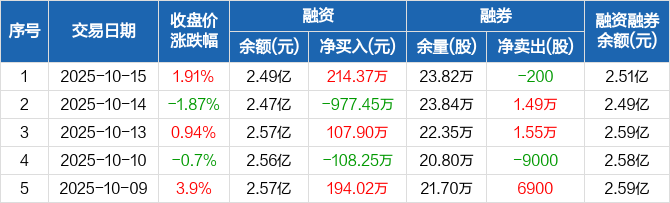 融资方面,当日融资买入3257.99万元,融资偿还3043.61万元,融资净买入214.37万元。融券方面,融券卖出100股,融券偿还300股,融券余量23.82万股,融券余额203.66万元。融资融券余额合计2.51亿元。