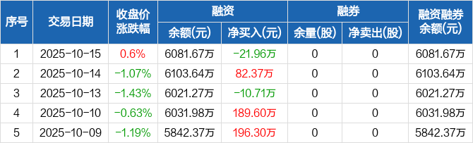 融资方面,当日融资买入263.63万元,融资偿还285.59万元,融资净偿还21.96万元。融券方面,融券卖出0股,融券偿还0股,融券余量0股,融券余额0元。融资融券余额合计6081.67万元。