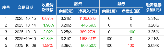 融资方面,当日融资买入2227.14万元,融资偿还1120.52万元,融资净买入1106.62万元。融券方面,融券卖出0股,融券偿还0股,融券余量0股,融券余额0元。融资融券余额合计3.31亿元。