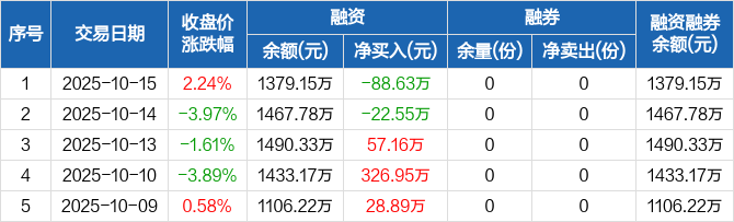 融资方面,当日融资买入222.11万元,融资偿还310.73万元,融资净偿还88.63万元。融券方面,融券卖出0份,融券偿还0份,融券余量0份,融券余额0元。融资融券余额合计1379.15万元。