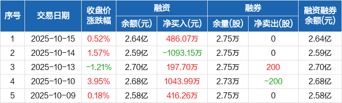 融资方面,当日融资买入1516.12万元,融资偿还1030.05万元,融资净买入486.07万元。融券方面,融券卖出0股,融券偿还0股,融券余量2.75万股,融券余额16.06万元。融资融券余额合计2.64亿元。