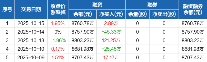 融资方面,当日融资买入447.96万元,融资偿还445.07万元,融资净买入2.89万元。融券方面,融券卖出0股,融券偿还0股,融券余量0股,融券余额0元。融资融券余额合计8760.78万元。