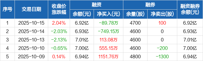 融资方面,当日融资买入895.36万元,融资偿还985.15万元,融资净偿还89.78万元。融券方面,融券卖出200股,融券偿还100股,融券余量4700股,融券余额12.71万元。融资融券余额合计6.92亿元。