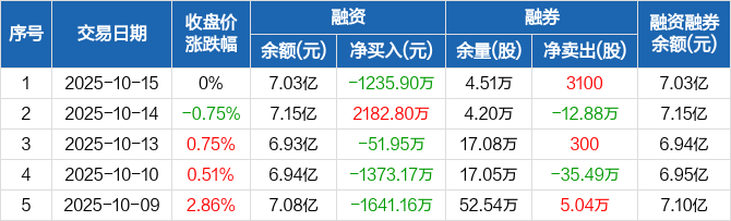 融资方面,当日融资买入3109.82万元,融资偿还4345.72万元,融资净偿还1235.9万元。融券方面,融券卖出3200股,融券偿还100股,融券余量4.51万股,融券余额17.95万元。融资融券余额合计7.03亿元。