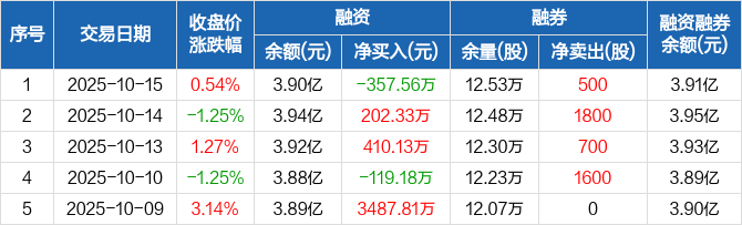 融资方面,当日融资买入894.05万元,融资偿还1251.61万元,融资净偿还357.56万元。融券方面,融券卖出500股,融券偿还0股,融券余量12.53万股,融券余额69.42万元。融资融券余额合计3.91亿元。