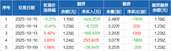融资方面,当日融资买入532.13万元,融资偿还956.38万元,融资净偿还424.25万元,连续3日净偿还累计593.4万元。融券方面,融券卖出0股,融券偿还7400股,融券余量2.48万股,融券余额11.9万元。融资融券余额合计1.19亿元。