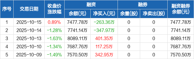 融资方面,当日融资买入394.98万元,融资偿还658.34万元,融资净偿还263.36万元。融券方面,融券卖出0股,融券偿还0股,融券余量0股,融券余额0元。融资融券余额合计7477.78万元。