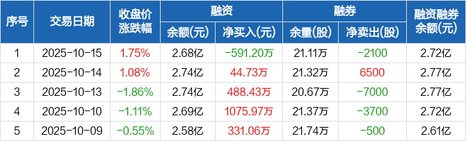 融资方面,当日融资买入1306.88万元,融资偿还1898.08万元,融资净偿还591.2万元。融券方面,融券卖出1100股,融券偿还3200股,融券余量21.11万股,融券余额343.25万元。融资融券余额合计2.72亿元。
