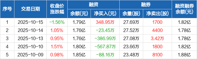 融资方面,当日融资买入969.48万元,融资偿还620.54万元,融资净买入348.95万元。融券方面,融券卖出2200股,融券偿还500股,融券余量27.69万股,融券余额262.22万元。融资融券余额合计1.82亿元。