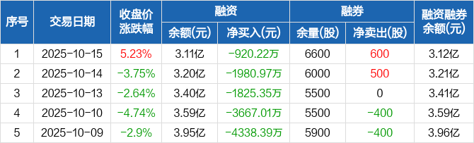 融资方面,当日融资买入3894.9万元,融资偿还4815.12万元,融资净偿还920.22万元,连续7日净偿还累计1.47亿元。融券方面,融券卖出700股,融券偿还100股,融券余量6600股,融券余额103.49万元。融资融券余额合计3.12亿元。