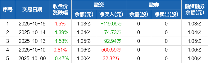 融资方面,当日融资买入171.33万元,融资偿还290.42万元,融资净偿还119.09万元,连续3日净偿还累计286.76万元。融券方面,融券卖出0股,融券偿还0股,融券余量0股,融券余额0元。融资融券余额合计1.03亿元。