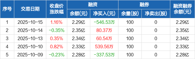 融资方面,当日融资买入833.71万元,融资偿还1380.24万元,融资净偿还546.53万元。融券方面,融券卖出0股,融券偿还0股,融券余量100股,融券余额873元。融资融券余额合计2.29亿元。