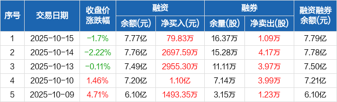 融资方面,当日融资买入1863.35万元,融资偿还1783.52万元,融资净买入79.83万元,连续9日净买入累计2.25亿元。融券方面,融券卖出1.1万股,融券偿还100股,融券余量16.37万股,融券余额141.93万元。融资融券余额合计7.79亿元。