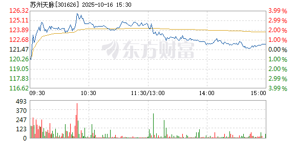苏州天脉盘中快速反弹,5分钟内涨幅超过2%,截至9点35分,报123.37元,成交1232.05万元,换手率0.39%。