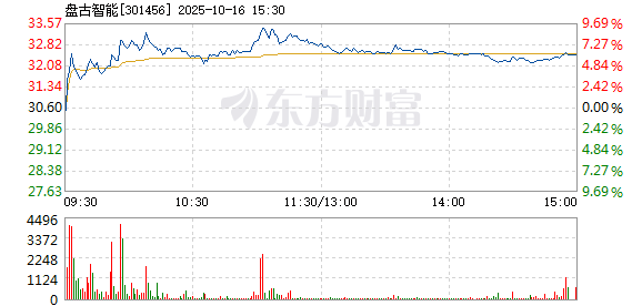 盘古智能盘中快速上涨,5分钟内涨幅超过2%,截至9点55分,报32.77元,成交1.17亿元,换手率6.04%。