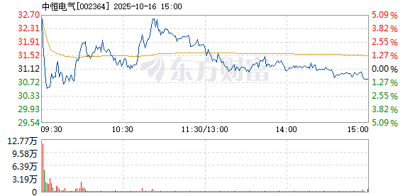 10月16日,中恒电气盘中快速反弹,5分钟内涨幅超过2%,截至9点57分,报31.42元,成交16.32亿元,换手率9.30%。