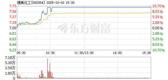 德美化工盘中打开涨停,现报7.68元,成交3.57亿元,换手率12.46%。该股之前于10点24分涨停。