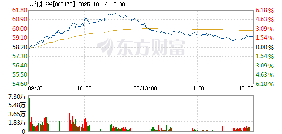 10月16日,立讯精密盘中涨幅达5%,截至10点51分,报61.11元,成交79.44亿元,换手率1.83%。