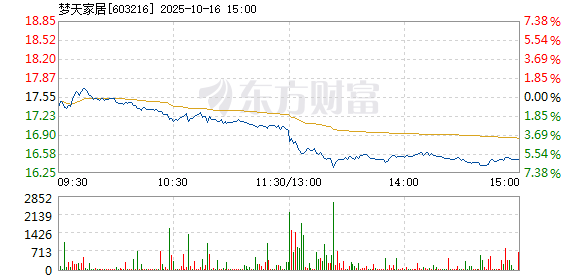 梦天家居盘中跌幅达5%,截至13点05分,报16.66元,成交6315.82万元,换手率1.65%。