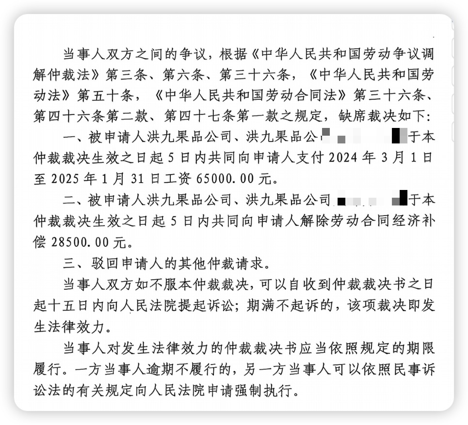 洪九果品一名离职员工告诉蓝鲸新闻记者,在将近半年没拿到工资后,2025年2月他从洪九果品离职并申请了劳动仲裁。在其提供的仲裁裁决书上,除了一笔生活费以外,2024年3月1日至2025年1月31日期间,洪九果品公司及分公司并未支付该离职员工的其余工资。