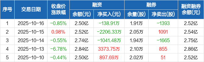 融资方面,当日融资买入1135.17万元,融资偿还1274.08万元,融资净偿还138.91万元,连续3日净偿还累计3386.73万元。融券方面,融券卖出307股,融券偿还1700股,融券余量1.91万股,融券余额173.1万元。融资融券余额合计2.52亿元。