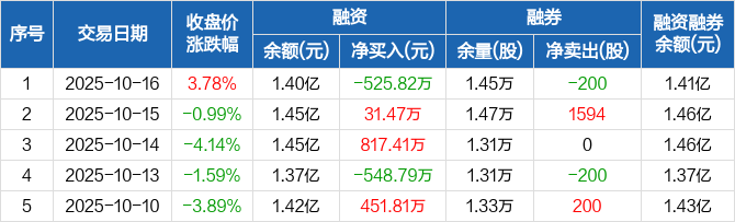 融资方面,当日融资买入1250.28万元,融资偿还1776.1万元,融资净偿还525.82万元。融券方面,融券卖出0股,融券偿还200股,融券余量1.45万股,融券余额95.23万元。融资融券余额合计1.41亿元。