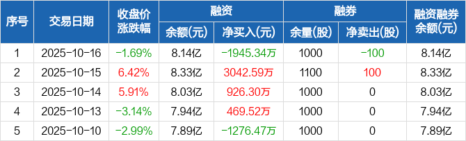 融资方面,当日融资买入7682.86万元,融资偿还9628.2万元,融资净偿还1945.34万元。融券方面,融券卖出0股,融券偿还100股,融券余量1000股,融券余额1.74万元。融资融券余额合计8.14亿元。