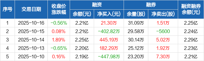 融资方面,当日融资买入770.07万元,融资偿还748.77万元,融资净买入21.3万元。融券方面,融券卖出2.11万股,融券偿还6000股,融券余量31.09万股,融券余额383.34万元。融资融券余额合计2.25亿元。