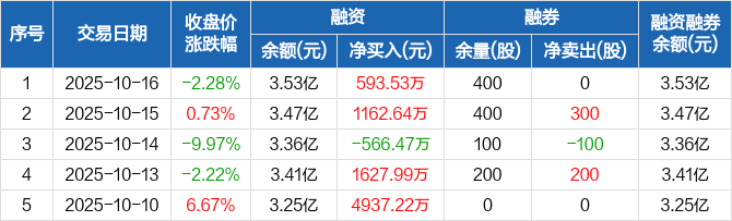 融资方面,当日融资买入2858万元,融资偿还2264.48万元,融资净买入593.53万元。融券方面,融券卖出0股,融券偿还0股,融券余量400股,融券余额7036元。融资融券余额合计3.53亿元。